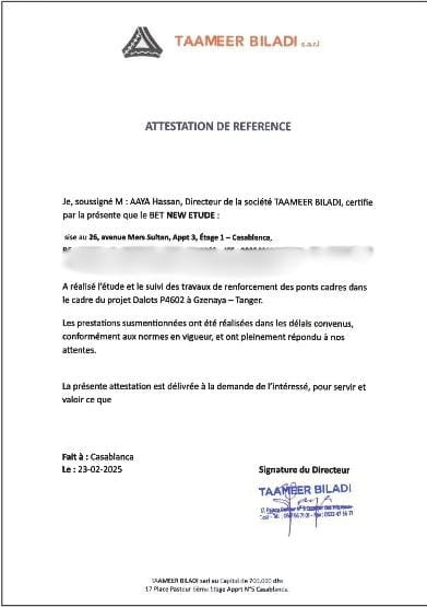 Notre expertise en ingénierie civile, alliée à une approche rigoureuse et conforme aux normes en vigueur, nous a permis de collaborer avec des acteurs de référence tels que OCP, JESA, le Ministère de l’Intérieur, le Ministère de l’Équipement et du Transport, l’ONDA, Al Omrane, ainsi que plusieurs opérateurs privés.