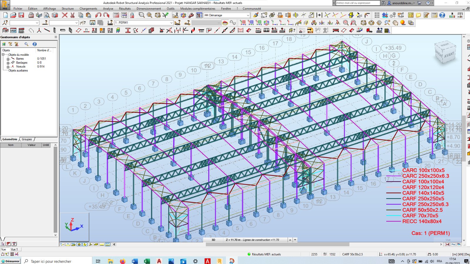 Ce projet de charpente métallique a fait l’objet d’études techniques complètes, incluant le dimensionnement des structures, la vérification de la stabilité et l’optimisation des sections, dans le respect des normes réglementaires.